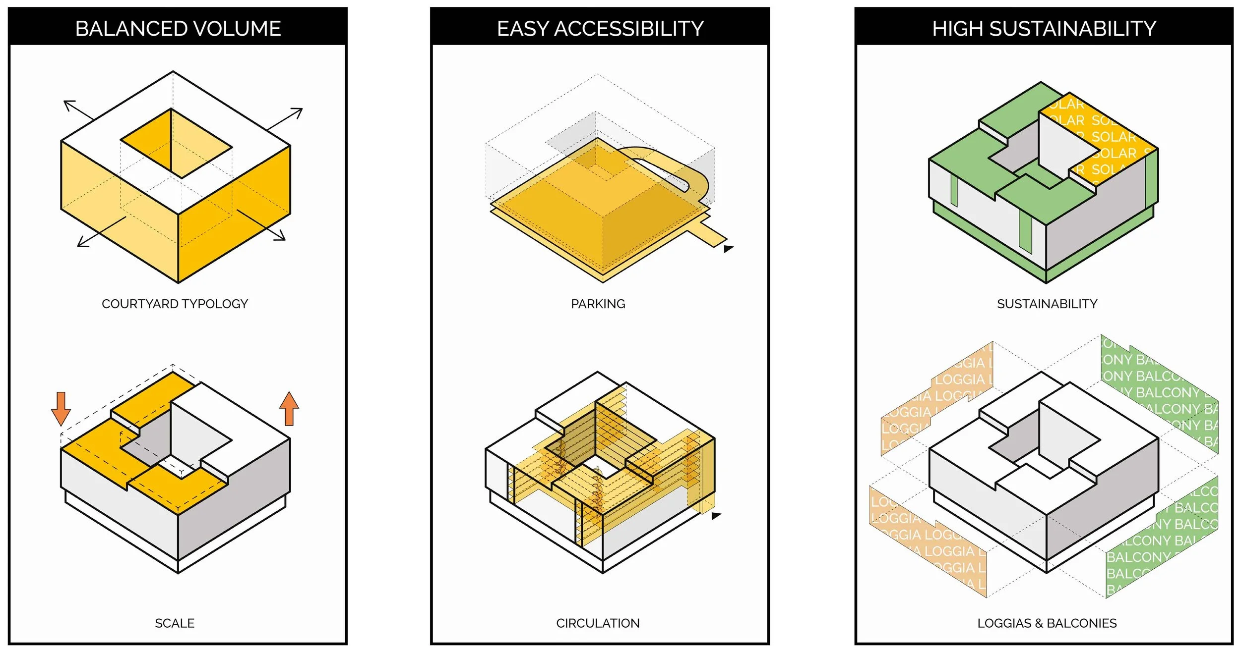 The design is organised around a central courtyard, forming a green and sheltered heart that encourages interaction among residents while maintaining a sense of privacy. This courtyard typology supports efficient layouts and high-quality living conditions, with dual-aspect apartments benefiting from optimal daylight, natural ventilation, and strong visual connections to shared outdoor spaces.